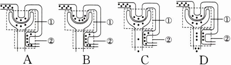 5. (2024·陕西中考)以下是健康人正常尿液形成过程示意图,其中在①②部位发生了重要的生理作用,“•”表示某种成分。能模拟尿素排出过程的是( )