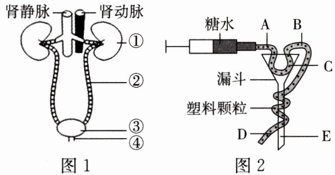 某校生物兴趣小组的同学为了解尿液的形成和排出过程,观察了泌尿系统模型(图1),并利用橡皮管、漏斗、不同大小的塑料颗粒、糖水和注射器等制作了如图2所示的“肾单位模型”。请回答下列问题。