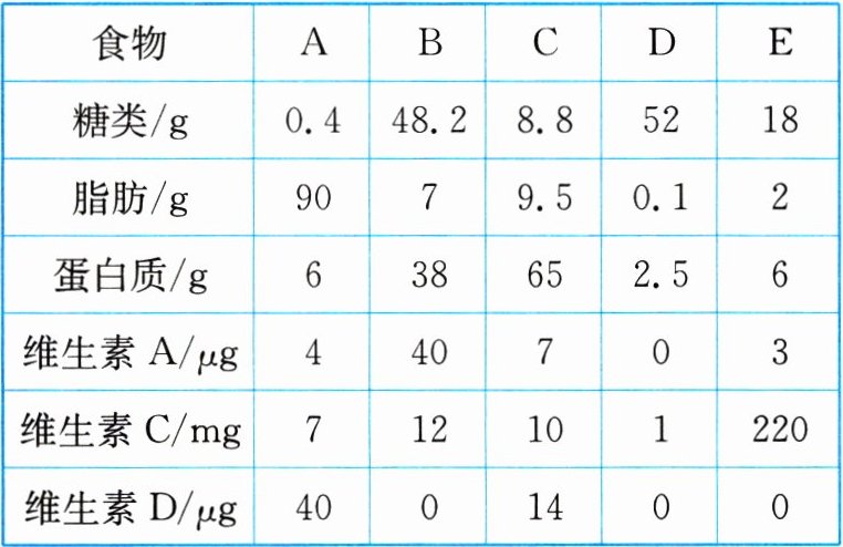 7. 下表列出了 A、B、C、D、E 五种食物(各 100 g)中除水和无机盐以外的主要成分。