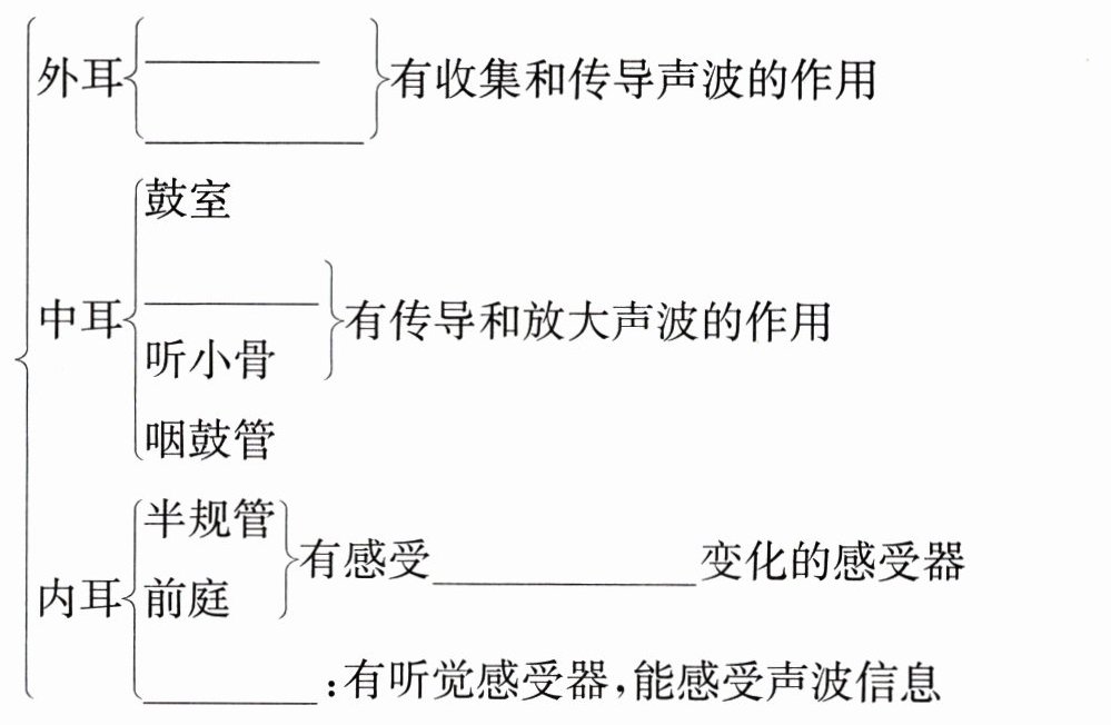 $\left\{\begin{array}{l}外耳\left\{\begin{array}{l}$_________$\\ $_________$\end{array} \right\}有收集和传导声波的作用\\中耳\left\{\begin{array}{l}鼓室\\$_________$\\听小骨\\咽鼓管\end{array} \right\}有传导和放大声波的作用\\内耳\left\{\begin{array}{l}半规管\\前庭\\$_________$:有听觉感受器,能感受声波信息\end{array} \right\}有感受$_________$变化的感受器\end{array}\right.$