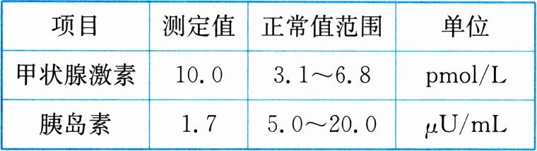 4. 下表所示为某成年人血液化验的两项结果,请据此分析,这个成年人最可能发生的生理现象是( )