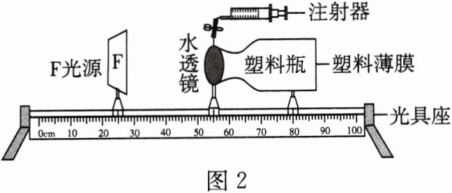 同学们利用可变焦的水透镜、塑料瓶等作为主要材料,利用物理实验室的光具座及配件来模拟人的眼球成像过程(向内推注射器,水透镜曲度变大,向外拉,则反之),如图2所示。请回答下列问题。