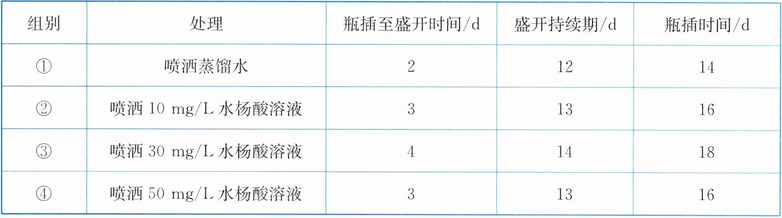 该实验的变量是______,设置①组的目的是______。每组放置10枝月季切花进行瓶插,这样做的目的是______。据表可知,喷洒______mg/L水杨酸溶液,月季切花保鲜效果最好。