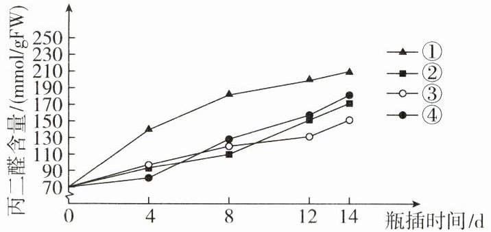 (2) 丙二醛含量变化是衡量细胞膜结构破坏程度的指标之一,丙二醛含量越高,细胞膜被破坏得越严重。由上图可知,喷洒水杨酸溶液组的丙二醛含量都______喷洒蒸馏水组,第14天时喷洒30 mg/L水杨酸溶液组中丙二醛含量______,说明细胞膜破坏的程度最轻,细胞内的水分流失最少,从而最有利于月季切花的保鲜。
