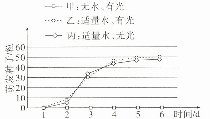 15. 为了探究大豆种子萌发的环境条件, 某实验小组将 150 粒大豆种子随机均分为 3 组进行实验, 结果如下图所示。根据实验结果, 可以得出的结论是 ( )