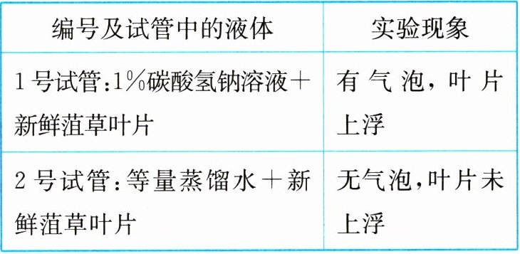 |1号试管:1%碳酸氢钠溶液+新鲜菹草叶片|有气泡,叶片上浮|