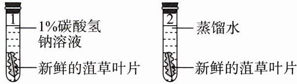 第二步:在1号试管中放入1%碳酸氢钠溶液(可释放二氧化碳),在2号试管中放入等量的蒸馏水(不含气体)。再将两片形状、大小基本一致的新鲜菹草叶片分别放入两支试管的底部。