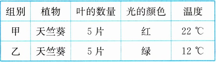 |组别|植物|叶的数量|光的颜色|温度|