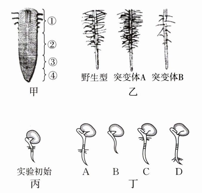 (5)图丙是某同学探究“根的哪一部位生长最快”的实验初始示意图,几天后观察到的情况应该是图丁中的______(填字母)。