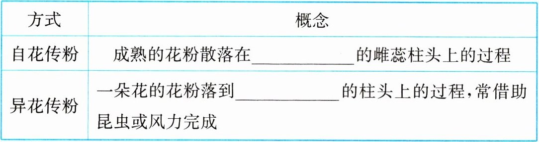 |异花传粉|一朵花的花粉落到______的柱头上的过程,常借助昆虫或风力完成|