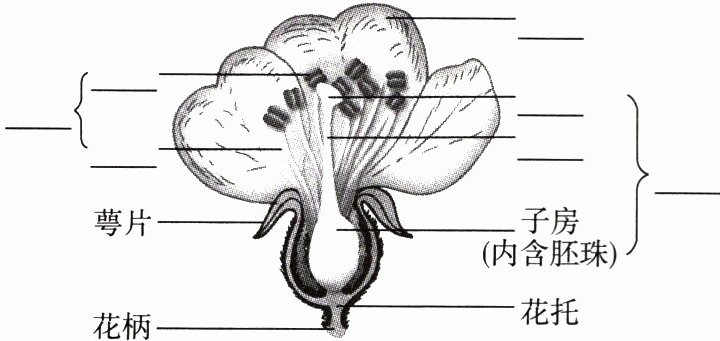 (由于题目未明确具体设问,若为结构填空,从上到下、从左到右依次可能为:花瓣、柱头、花柱、花药、花丝、雄蕊、雌蕊、花的主要结构)