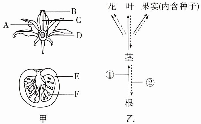 10. (2024 成都中考)植物与人类关系密切。小蓉同学在学习绿色开花植物的生活方式和生活史的过程中,进行了“种植番茄”的实践活动,观察到番茄从“种子到种子”一生所经历的生长、发育和繁殖过程。图甲是番茄部分生殖器官结构示意图,图乙是番茄植株内物质运输示意图。回答下列问题。