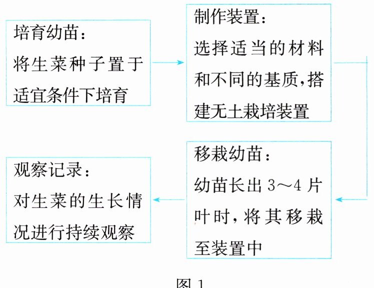 培育幼苗:将生菜种子置于适宜条件下培育→制作装置:选择适当的材料和不同的基质,搭建无土栽培装置→移栽幼苗:幼苗长出 3~4 片叶时,将其移栽至装置中→观察记录:对生菜的生长情况进行持续观察
