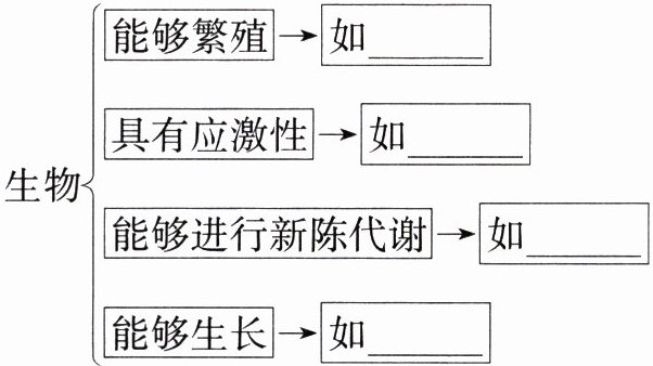$生物\begin{cases}能够繁殖\to如\underline{\quad\quad}\\具有应激性\to如\underline{\quad\quad}\\能够进行新陈代谢\to如\underline{\quad\quad}\\能够生长\to如\underline{\quad\quad}\end{cases}\underline{\quad\quad} $