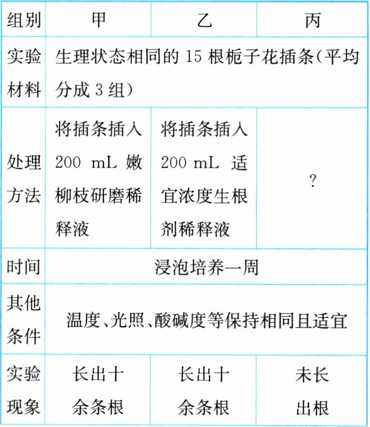 10. (探究实践)人们常说“有心栽花花不开,无心插柳柳成荫”,体现了柳树的扦插成活率高。为了弄清楚其中的奥秘,某兴趣小组利用课后服务时间设计实验,探究柳树枝条研磨液能否促进植物插条生根。实验过程如下,请你完成实验并回答下列问题。