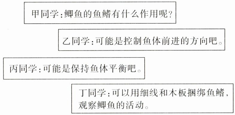 丁同学:可以用细线和木板捆绑鱼鳍,观察鲫鱼的活动。