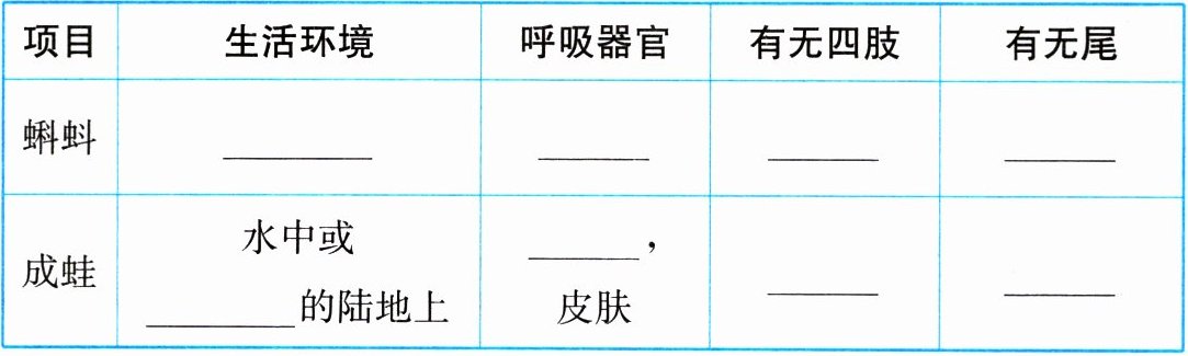 1.精子 卵细胞 蝌蚪 幼蛙 2.体外 水中 3.水中 鳃 无 有 潮湿 肺 有 无 4.形态结构 变态
