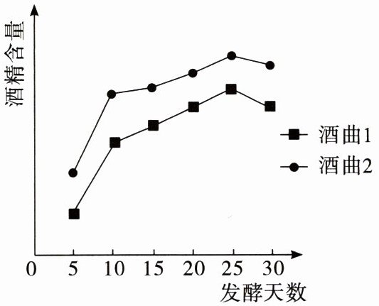 。[图示酒精含量随发酵天数变化的曲线,酒曲1和酒曲2两条曲线]