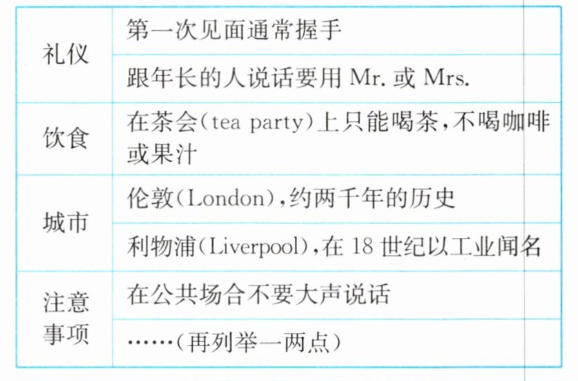 俗话说,“入乡随俗”,当我们要去另一个国家的时候,先了解其习俗和历史是很有必要的。请你根据下面的表格内容提示,写一篇英语文章,介绍英国的一些历史和习俗。