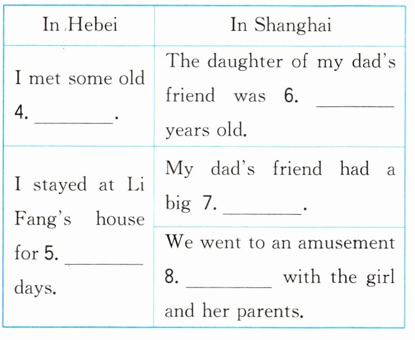 I saw a path leading into some woods. "I'll race you!" I shouted. Then we rode towards the woods. 6, the path wasn't as smooth as I thought. I kept bumping (颠簸) up and down, and then suddenly... bam! I fell 7 my bike. I 8 my elbows and knees bleeding. "Ha-ha!" My friend made a face and helped me up. "Be more careful next time," she said. Tears ran down my 9. "Sorry," I said.