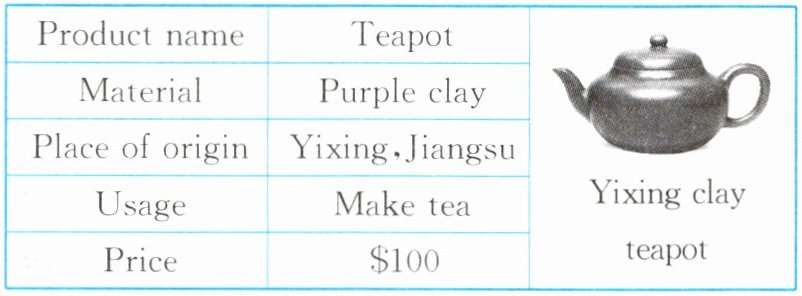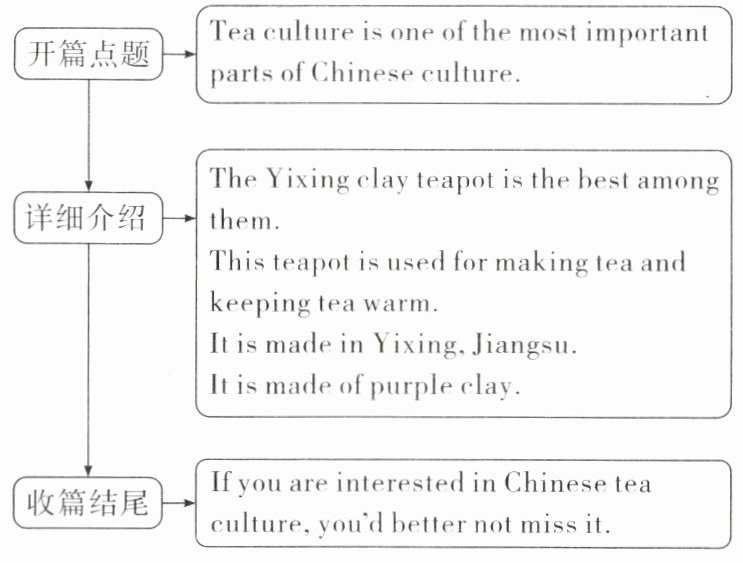 4. 写作要点$:$开篇点题:$Tea culture is one of the most important parts of Chinese culture.$详细介绍:$The Yixing clay teapot is the best among them. This teapot is used for making tea and keeping tea warm. It is made in Yixing,Jiangsu. It is made of purple clay.$收篇结尾:If you are interested in Chinese tea culture, you'd better not miss it.