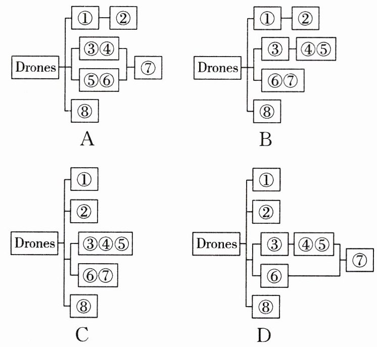 11. B 解析:推理判断题。根据“More than 100,000 people cheered at the breathtaking moment when 3,000 drones flew over Chaotianmen on the Chinese New Year Eve.”可知,本文通过超过10万人观看无人机在除夕飞行这一事件,引出对无人机的介绍。故选 B。12. A 解析:词义猜测题。根据“For weak wildlife populations, drones can show where poachers are hiding and if they are carrying guns.”可知,躲藏并携带枪支的是非法捕猎者。故选 A。13. D 解析:文章结构题。第一段引出无人机话题;第二段介绍无人机的可操控性;第三段介绍无人机可以完成困难和特殊任务;第四段和第五段介绍了这样的任务;第六段介绍无人机可以为公众提供便捷,与第三段并列;第七段是对无人机作用的总结;第八段介绍了无人机产业。因此 D 选项符合。故选 D。14. C 解析:推理判断题。根据“The drone industry is believed to be full of chances and possibilities.”可知最后一句介绍了无人机产业的未来是充满无限机会和可能的,所以之后作者会讨论无人机产业的未来。故选 C。