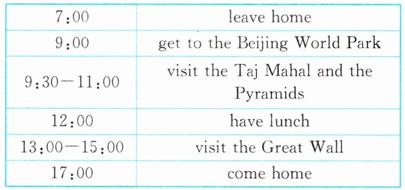 Last Sunday, I went to Beijing World Park with my parents. We left home at 7:00. At 9:00, we got to the park. From 9:30 to 11:00, we visited the Taj Mahal and the Pyramids. They were amazing. Then we had lunch at 12:00. After lunch, we visited the Great Wall from 13:00 to 15:00. Finally, we came home at 17:00. We had a great time.