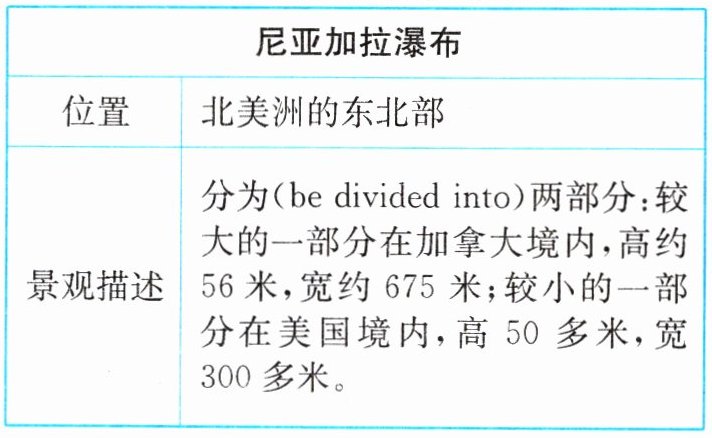 请根据下面的表格信息,以“The Niagara Falls”为题写一篇80词左右的英语短文。