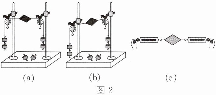 (3)小明在课后也自选器材继续研究二力平衡的条件,设计了如图 2 所示的 3 个实验方案(每个钩码质量均为$50g$),其中,能验证二力平衡时两个力大小相等、方向相反的是______(选填字母)。