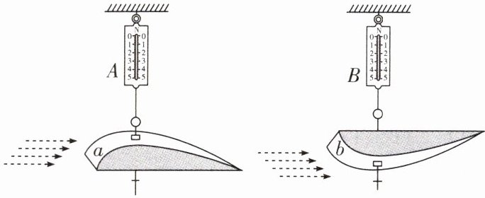 [典例 2] 图示是两个完全相同的机翼模型 $ a $ 和 $ b $,均只能沿竖直方向上下自由运动,$ A $、$ B $ 两弹簧测力计的示数分别为 $ F_A $、$ F_B $,下列说法正确的是(