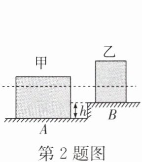 2. (2025·上海)高度相同的两均匀柱体甲、乙,分别置于高度差为$ h $的A、B两个水平面上,如图所示,它们对水平面的压强$ p_{甲} $大于$ p_{乙} $。若沿图中水平虚线方向切去部分后,则甲、乙剩余部分对A、B水平面的压强$ p_{甲}' $、$ p_{乙}' $的关系是(