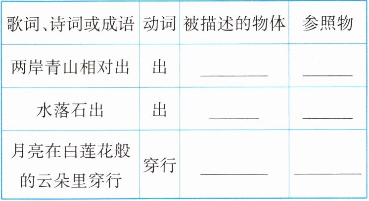13. 歌词、诗词和成语中常有对物体运动情况的描述,请你根据列出的动词填上被描述的物体和参照物。