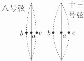14. 如图所示,航天员在“天宫”弹奏古筝,分别拨动古筝的八、十三号弦,用同一设置的相机拍摄到两弦最左摆到 b 处,最右摆到 c 处,静止时在 a 处。测出每振动 880 次,八号弦用时 2 s,十三号弦用时 4 s,则八号弦(