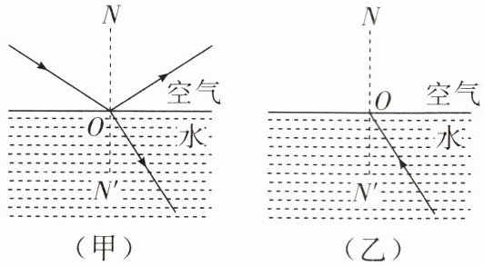 10. 光从空气斜射到水面时,一部分光射进水中,另一部分光返回到空气中,其光路如图(甲)所示。现在让光逆着折射光线的方向从水中斜射到与空气的分界面,请在图(乙)中画出相应的折射光线和反射光线。