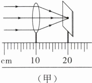 (1) 如图(甲)所示,平行光正对凸透镜照射,光屏上出现一个最小、最亮的光斑,则该凸透镜的焦距为$f = $