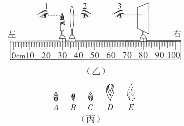 (选填“1”“2”或“3”)处能观察到烛焰的像。(4) 实验得到了凸透镜成像的规律,发现在图(丙)中烛焰$A$通过凸透镜不可能形成的像是