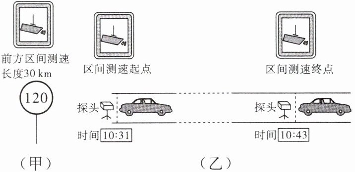 12. (2025·宣城)“区间测速”可以有效监管汽车超速,在一段道路上布设两个监控,分别记录车辆到达“测速起点”和“测速终点”的时间,计算出此区间平均速度来判断汽车是否超速。图(甲)为国庆节期间小明和爸爸开车去黄山旅游经过某一区间测速告知标志,通过该封闭路段的时间如图(乙)所示。