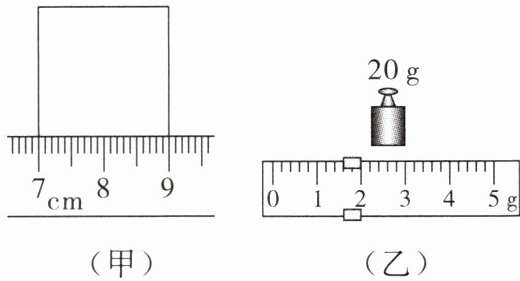 6. 小雨参加社区志愿服务活动时,捡到一块正方体金属块。她想知道金属块的密度,于是用刻度尺测出它的棱长,如图(甲)所示;用托盘天平测它的质量时,右盘中所放砝码的质量和游码在标尺上的位置如图(乙)所示。则金属块的棱长为