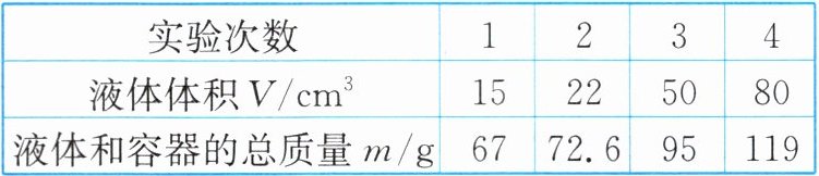9. 小明同学在测定液体密度的实验中,没有把容器的质量测出来,而是多次测出容器和液体的总质量,并记录在下表中。根据表中的数据求得液体的密度是