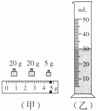 (1)正确操作测量未知液体的质量。当托盘天平横梁水平平衡时,右盘中砝码大小及游码的位置如图(甲)所示,则放在左盘中的烧杯和液体的总质量为