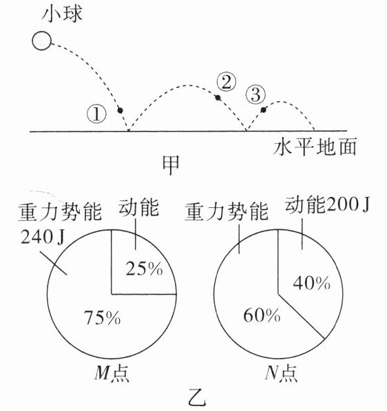 7. 一个小球被水平抛出后,其部分运动轨迹如图甲所示,图中位置①和位置③距离地面的高度相同。图乙中的M、N两点对应图甲中“①”“②”或“③”中的两个位置,其动能和重力势能的参数如图乙所示,则(