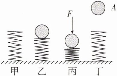 4. 一段弹簧固定在水平桌面上(如图甲所示),将一个小球放在弹簧上使其处于静止状态(如图乙所示),用竖直向下的力压小球至如图丙的位置,然后撤去力F,小球向上运动到A点后下落(如图丁所示)。不计空气阻力的影响,则从撤去力F到小球运动到A点的过程中,下列说法正确的是(