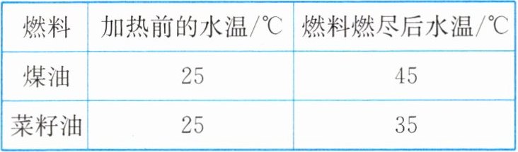 12. 小明同学学习了燃料的热值后,他想设计一个实验来探究煤油和菜籽油的热值的大小关系。他组装了如图所示的装置进行实验,记录结果如表: