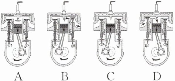 5. (物理学与工程实践)(2024·临沂中考)2024 年 4 月 20 日,我国研制的全球首款本体热效率达 53.09%的柴油机正式亮相世界内燃机大会,刷新了柴油机热效率的世界纪录。如图所示,内燃机的四个冲程,其中气缸内气体的内能最小的是(