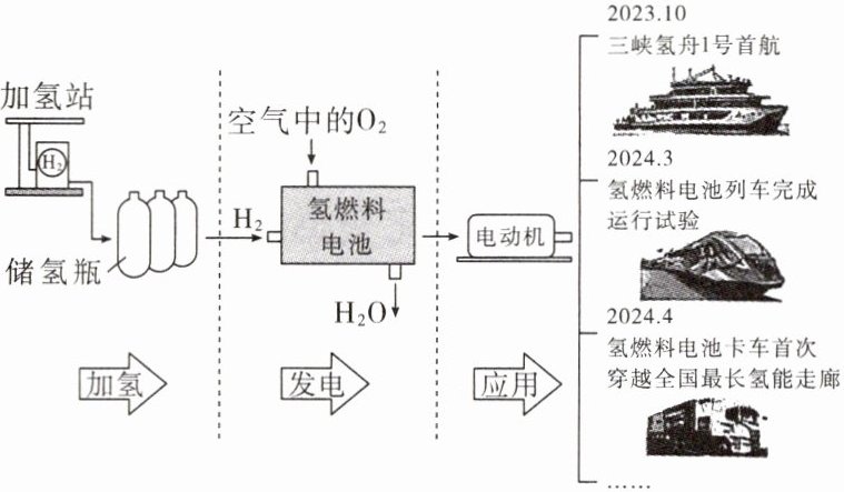 3. (物理学与工程实践)(2024·湖北中考)据统计,每燃烧 1 kg 燃油约排放 3.3 kg 二氧化碳。为实现碳达峰、碳中和的目标,氢能作为一种绿色低碳的清洁能源在我国交通领域的应用场景不断扩大,使用氢燃料电池的交通工具不断丰富,其应用流程如下。