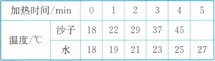 。使用相同的酒精灯,目的是使相同时间内沙子和水吸收的热量相同