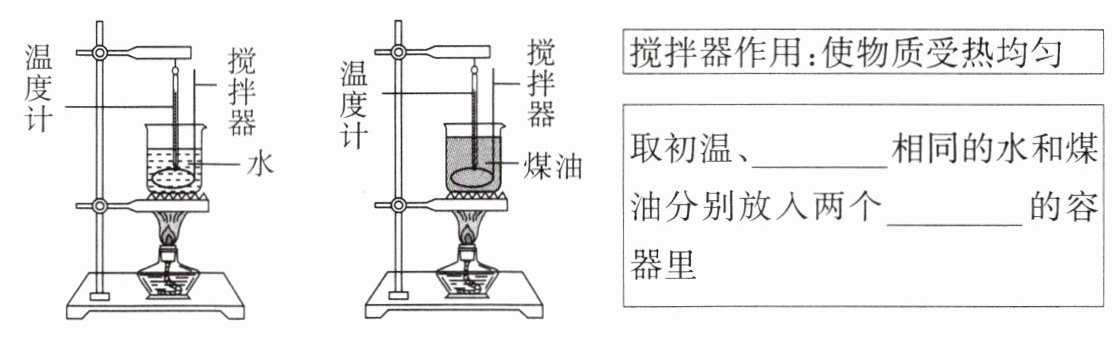 取初温、质量相同的水和煤油分别放入两个相同的容器里;