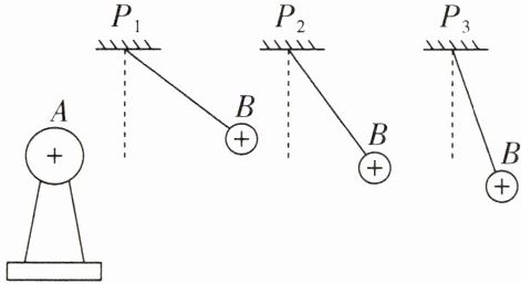 12.(科学探究)小明学过摩擦起电之后,自己在实验室里做了如下实验:在绝缘支架上放一个大球 A,并使其也带正电荷;用绝缘丝线悬吊一个小球 B,并使其也带正电荷。然后他依次将小球 B 悬吊在距离 A 球远近不同的 $P_1$、$P_2$、$P_3$ 处(如图所示)。