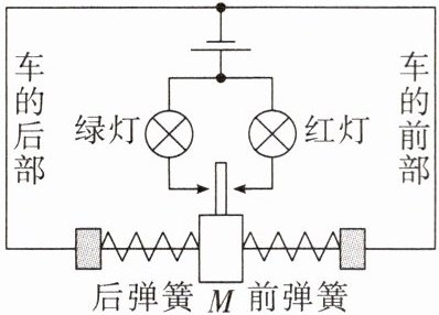 10.(物理学与工程实践)汽车中有如图所示的电路。电路中上端带金属细杆的金属滑块 M 与两侧金属弹簧相连并接入电路中,M 与弹簧套在光滑绝缘的水平细杆上。汽车静止时,M 上的金属细杆与红、绿灯下端的触头都不接触,那么当汽车向前启动时,红灯______