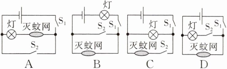 3. 如图所示的灭蚊拍具有灭蚊和照明功能,当只闭合开关$S_1$时,灭蚊拍能灭蚊但灯不亮;当$S_1和S_2$都闭合时,灭蚊拍既能灭蚊又能照明。选项中设计的电路图符合上述功能的是(